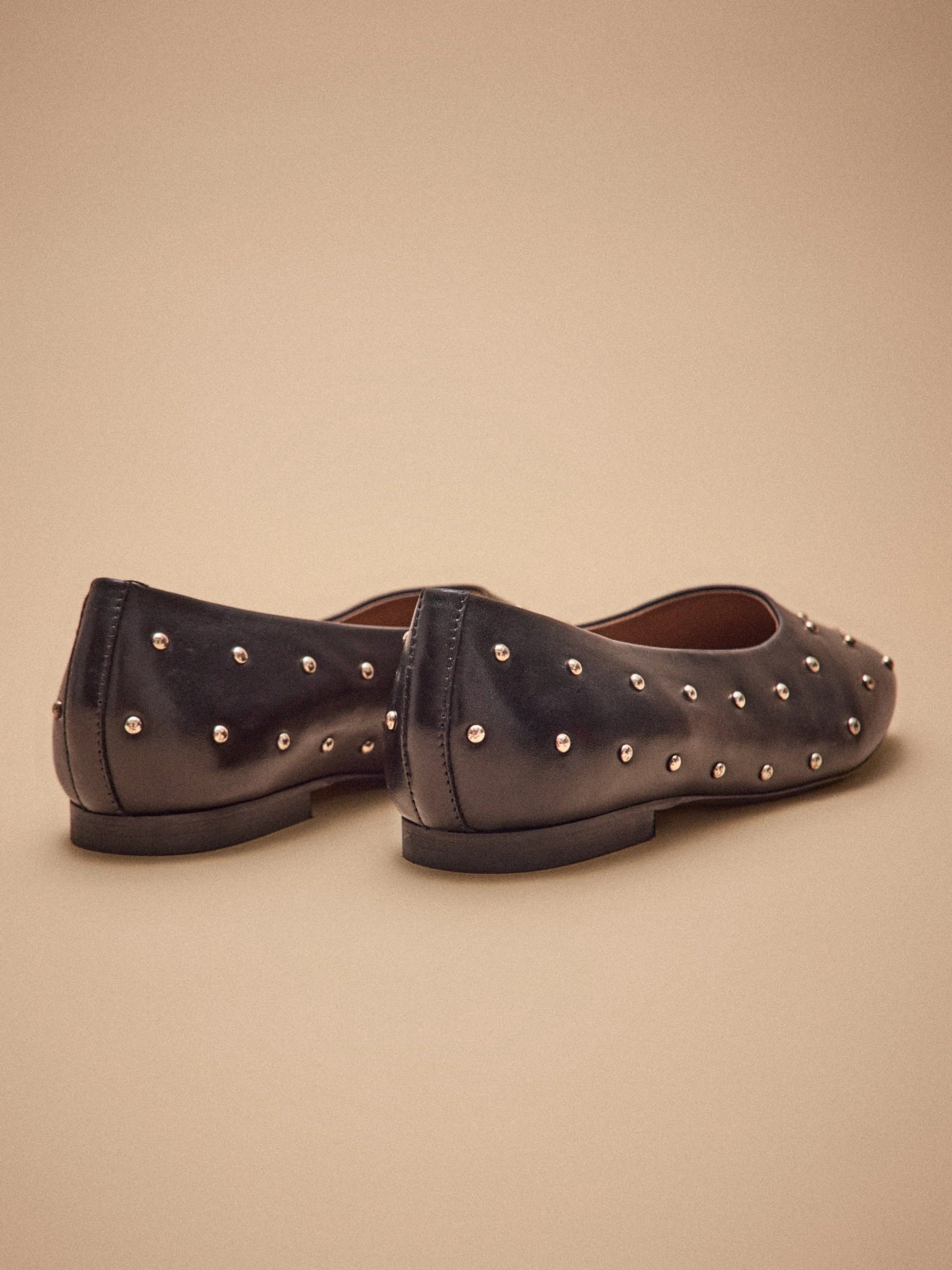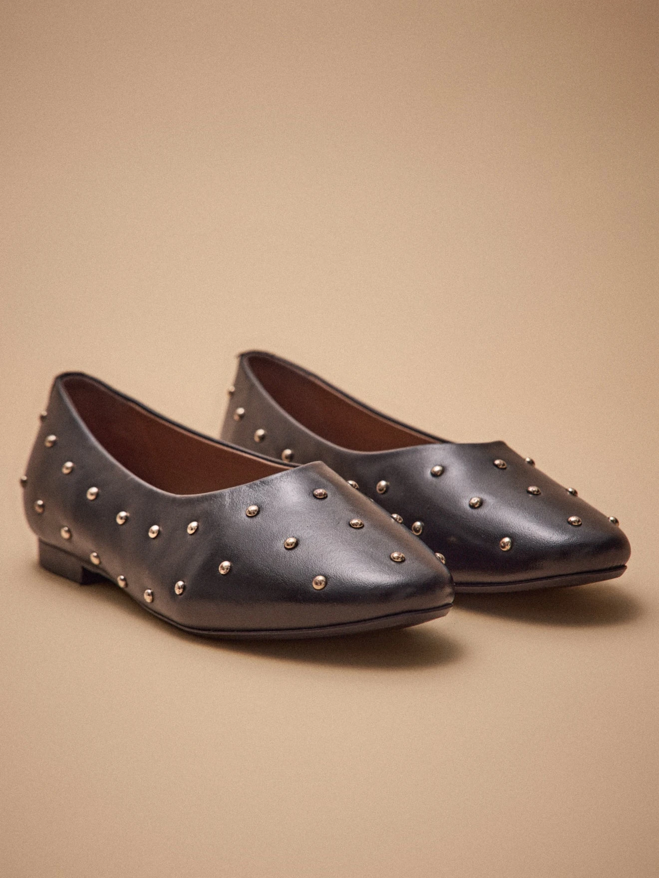 Avec leur fantaisie cloutée, leur coloris noir au-dessus des modes, leur petit talon et leur look urbain, les ballerines mettent la silhouette en valeur et l’élégance au premier plan.