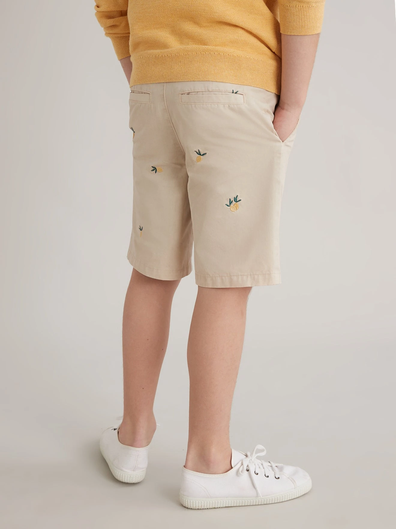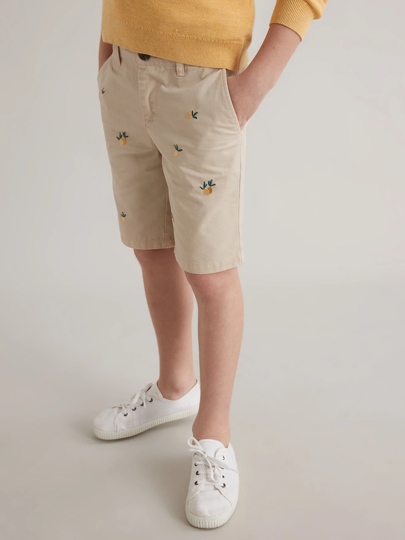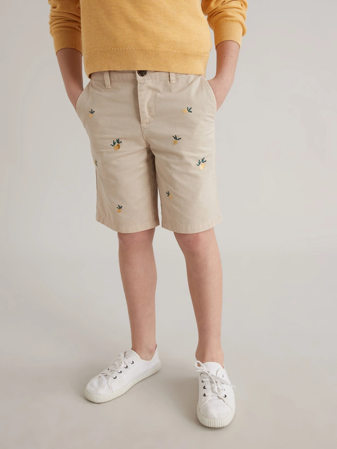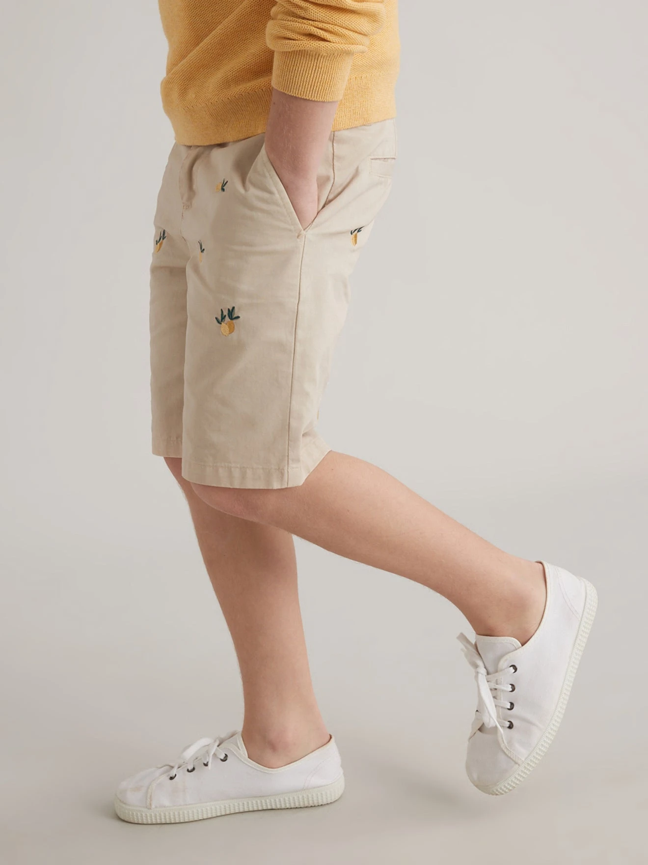 Des citrons brodés sur un twill de coton très agréable à porter, cette broderie est également disponible dans la collection fille et bébé.
