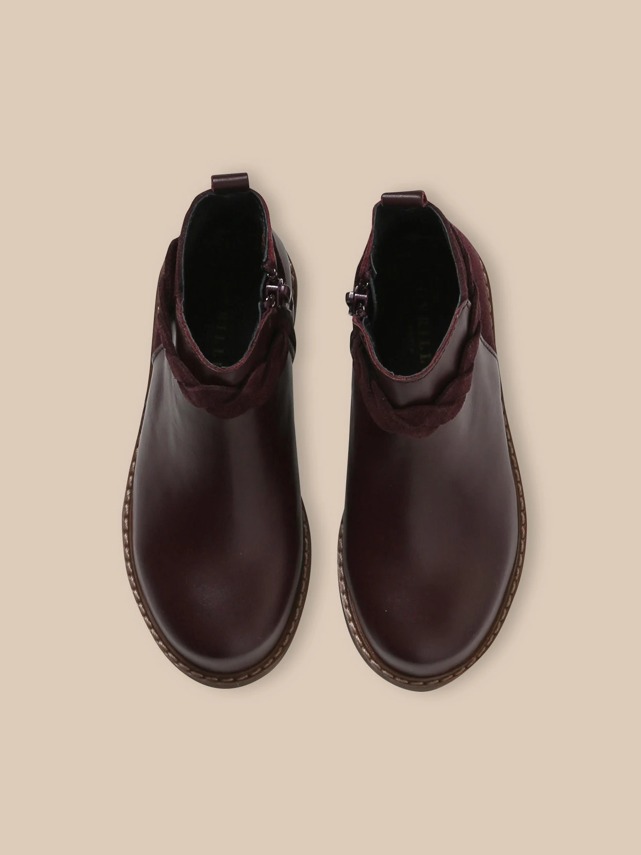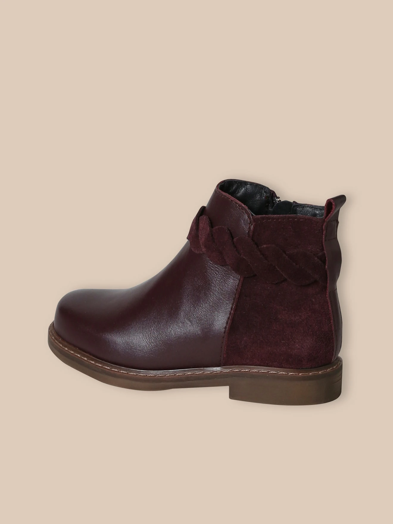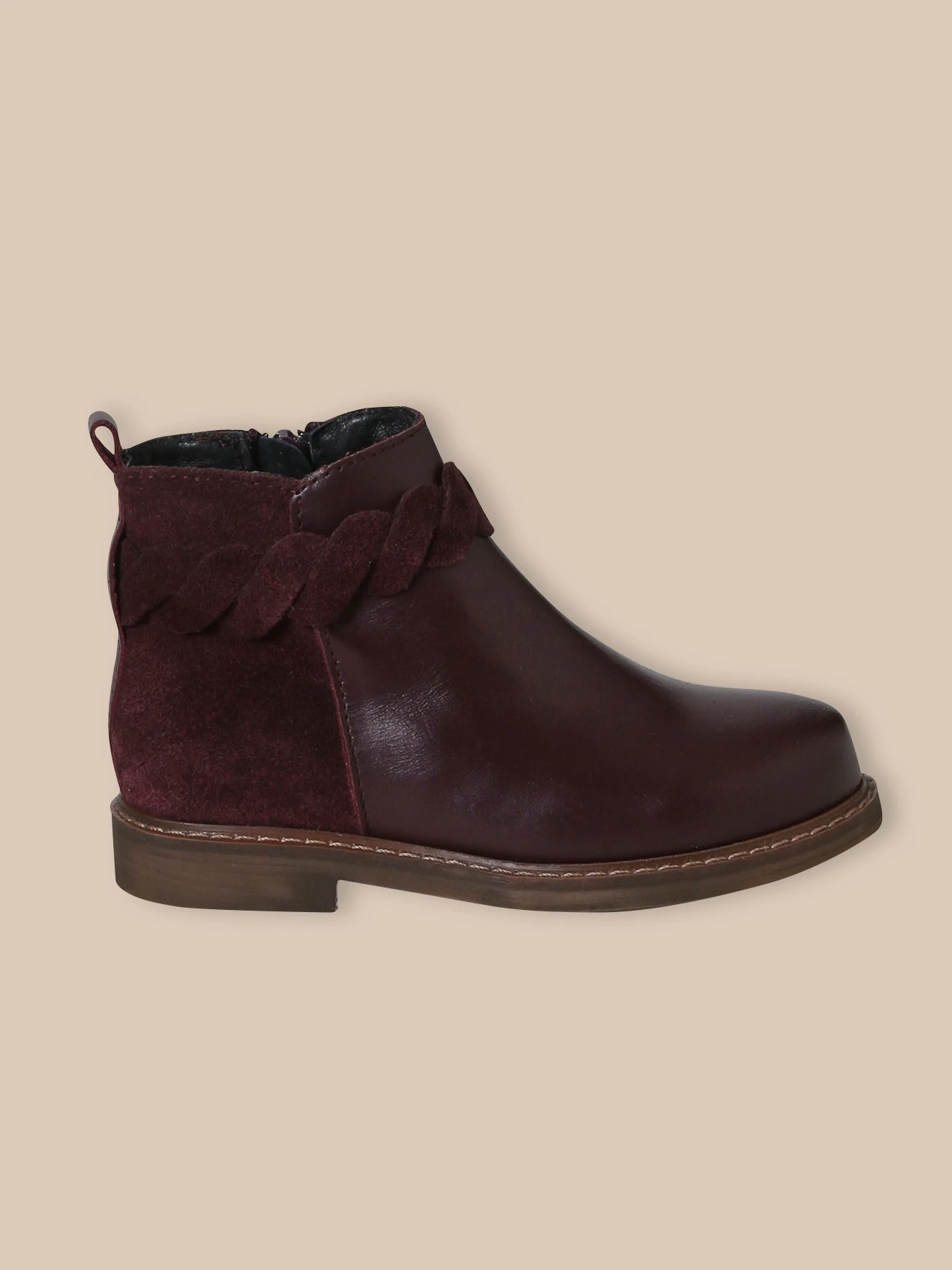 Boots en cuir lisse, délicatement soulignée d’une tresse en cuir velours.