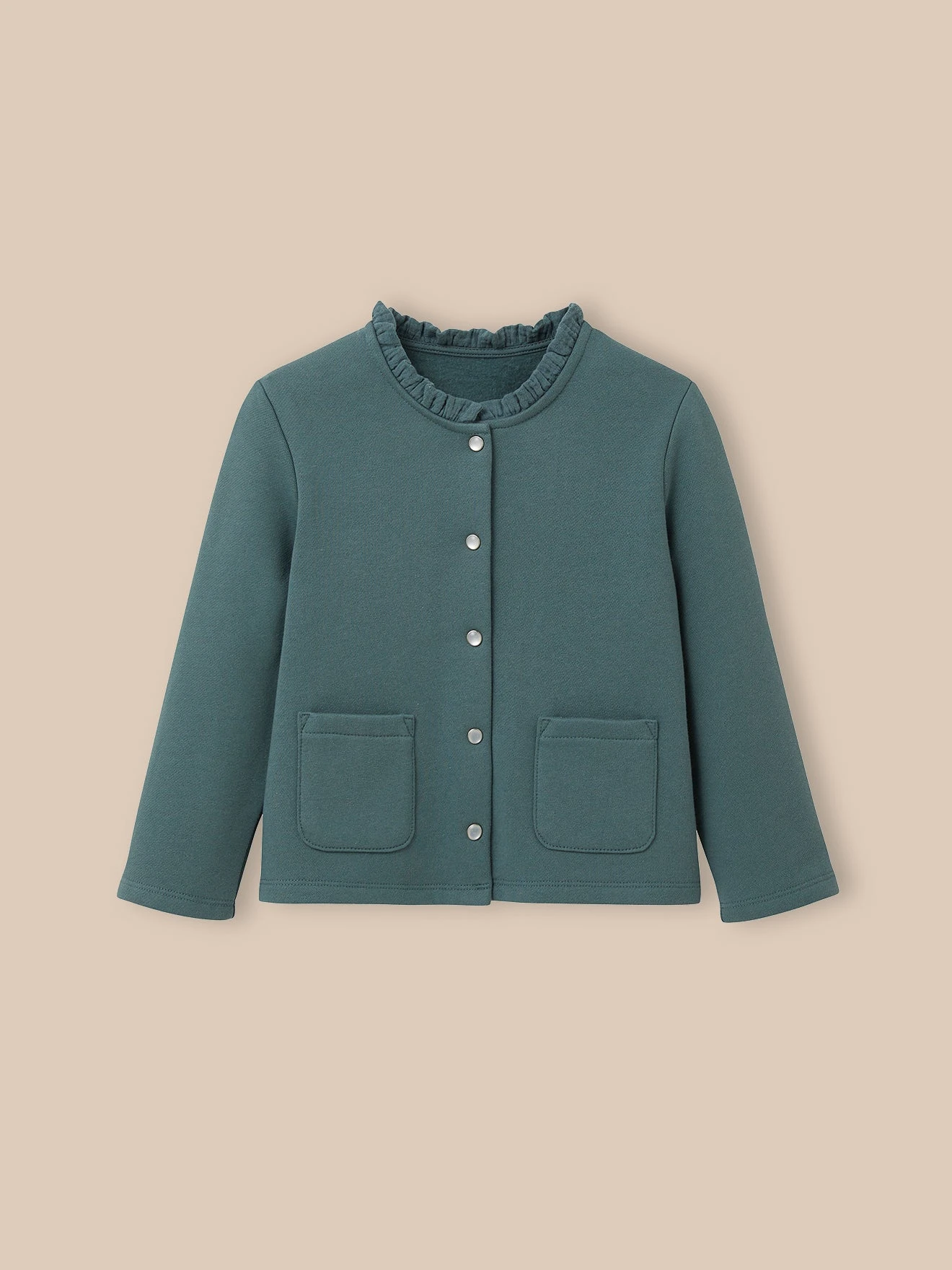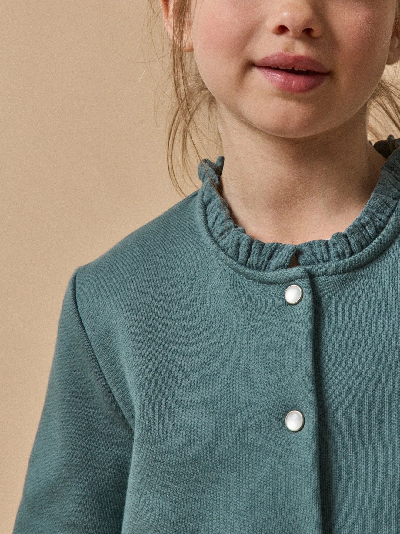 Gilet en molleton fermé par des boutons pressions effet nacre, petit col montant volanté en gaze et intérieur douceur. Le confort d’un sweat, les détails raffinés en plus.