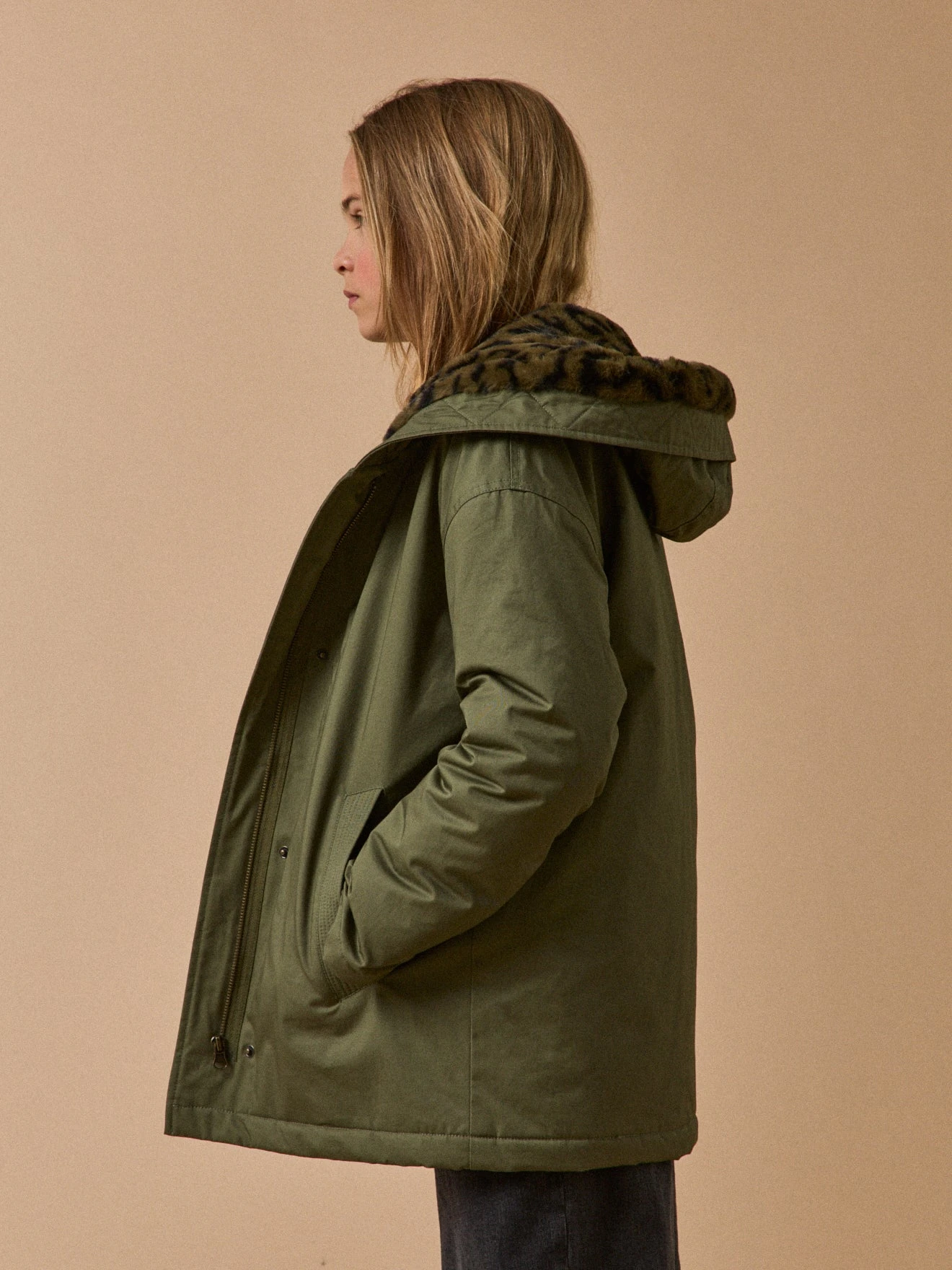 Doublure toute douce en imitation fourrure léopard et dessus en pur coton déperlant. Cette saison, la parka courte est tendance, pratique et douillette.