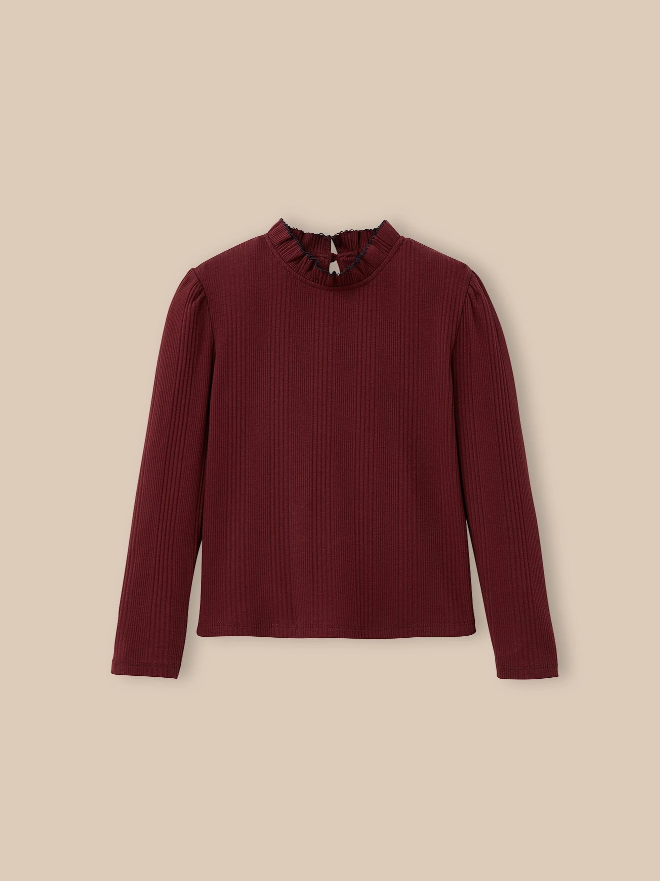Un sous-pull raffiné, avec un col volanté souligné d’un biais contrasté et une maille côtelée irrégulière.