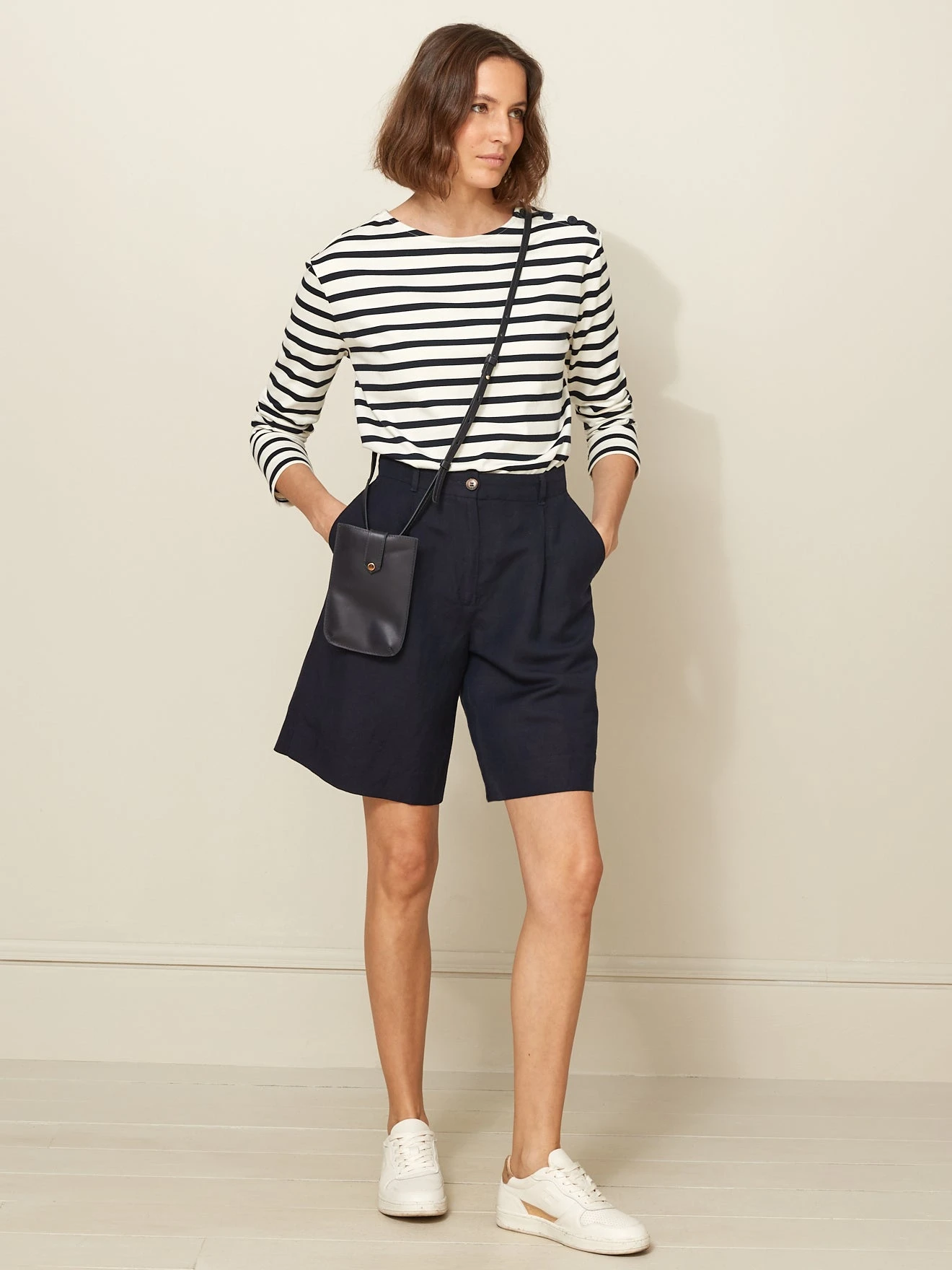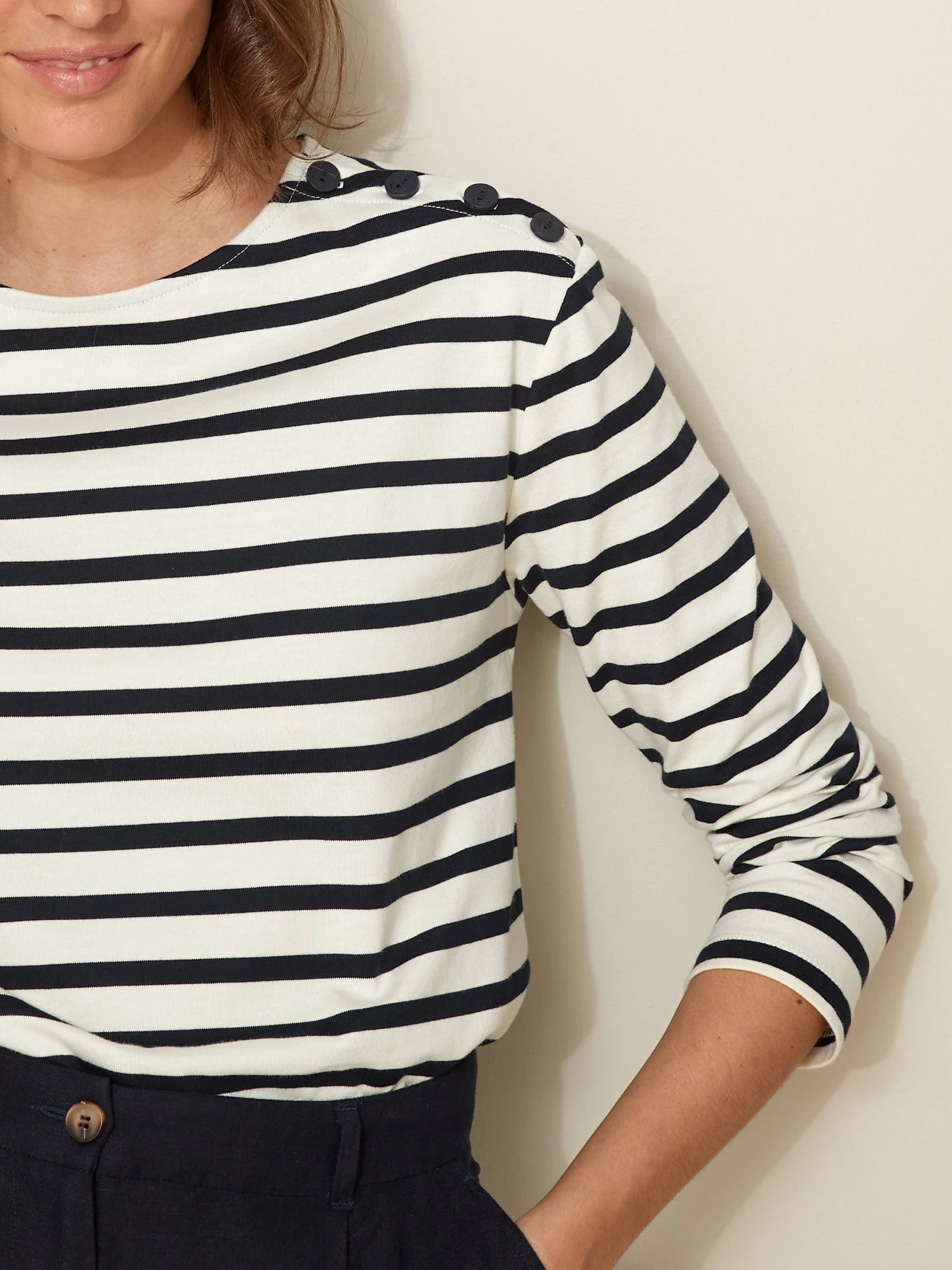 Pièce-phare de notre collection, la marinière se réinvente en coton biologique sur un volume boîte, sans s’éloigner de ses racines.