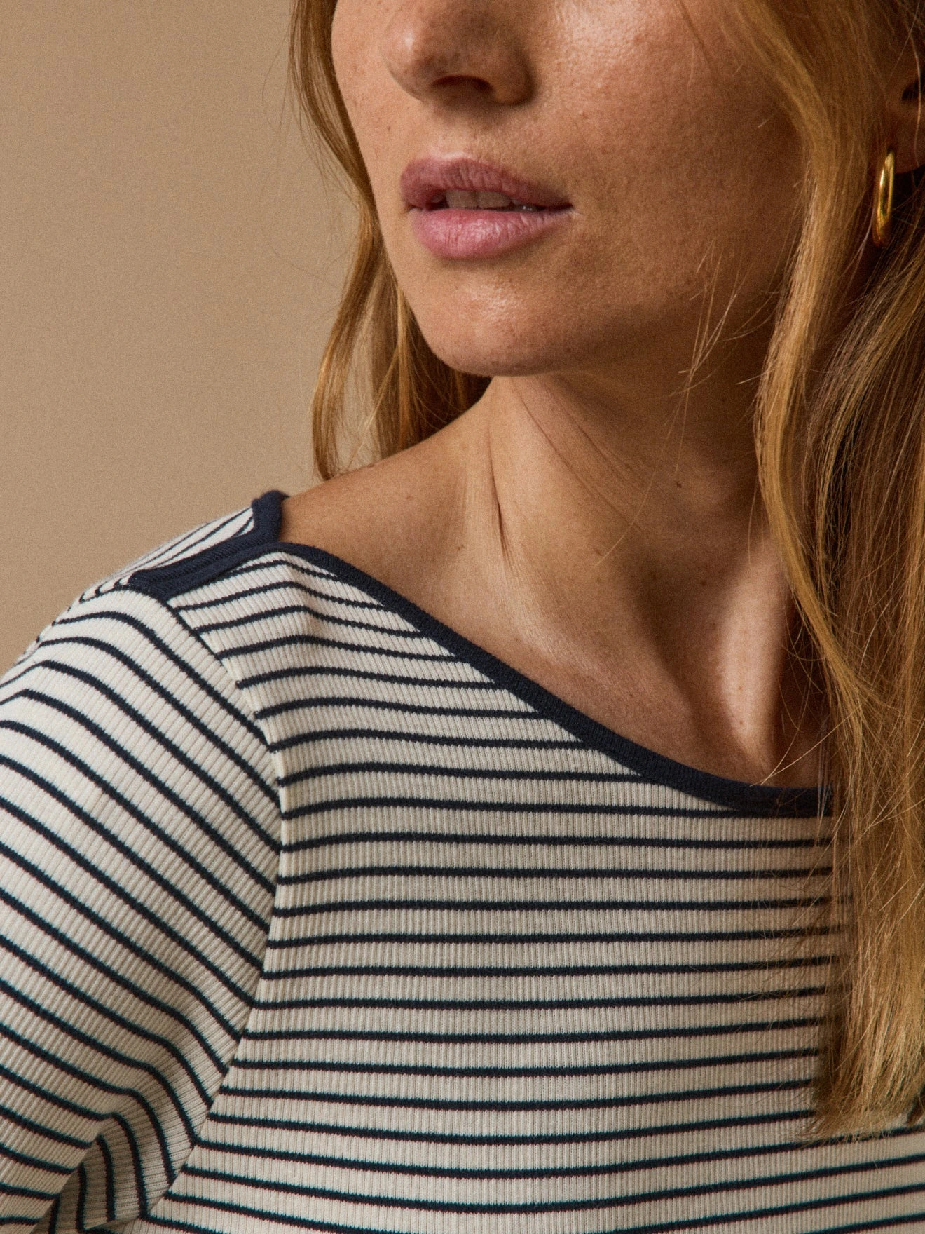 - Bord-jersey uni à l’encolure bateau et sur les épaules ; manches longues