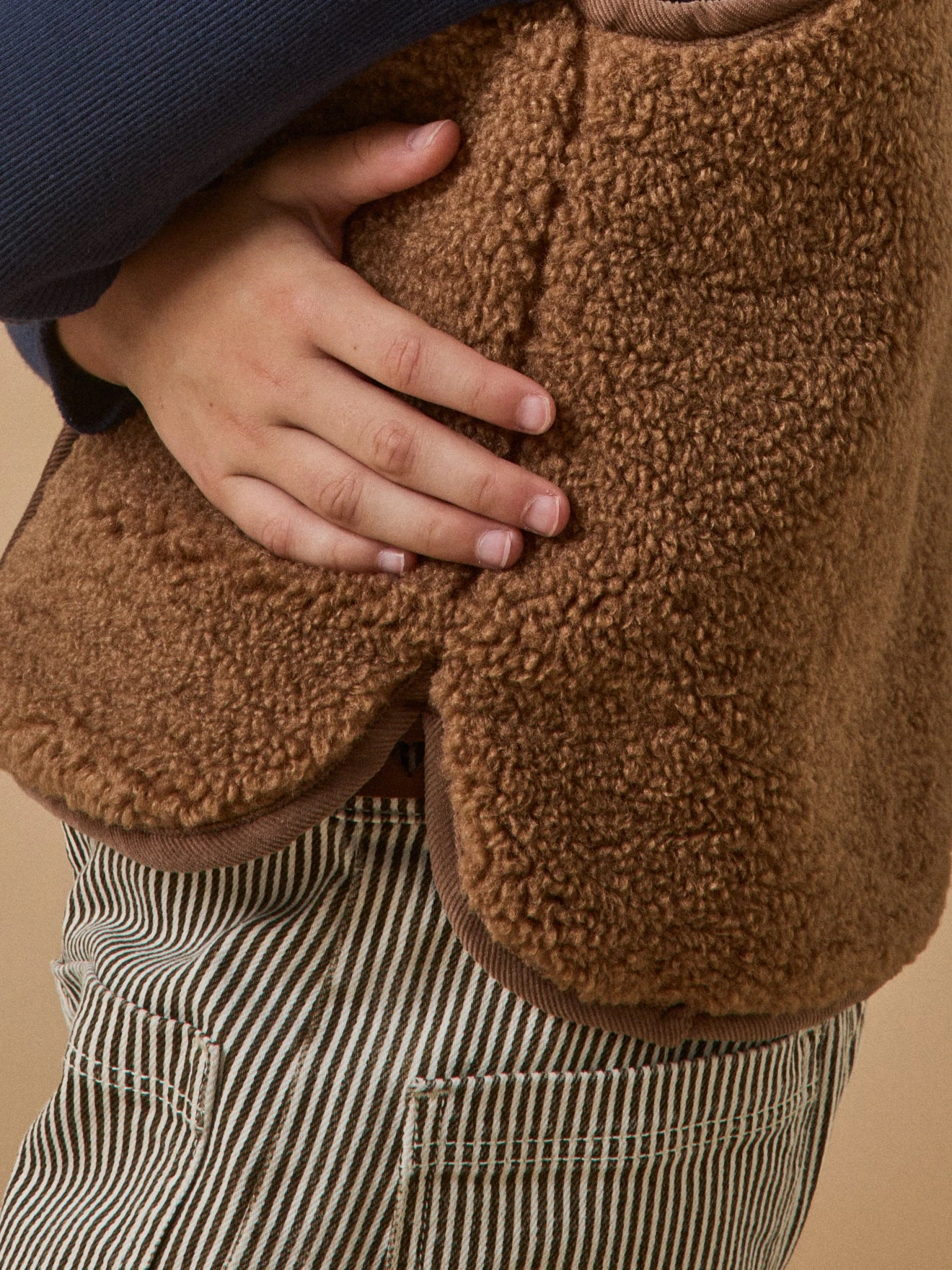 Style, douceur et finitions soignées. La veste moutonnée sans manches à fière allure de l’automne au printemps : en veste d’extérieur en entrée de saison, en cardigan au coeur de l’hiver.
